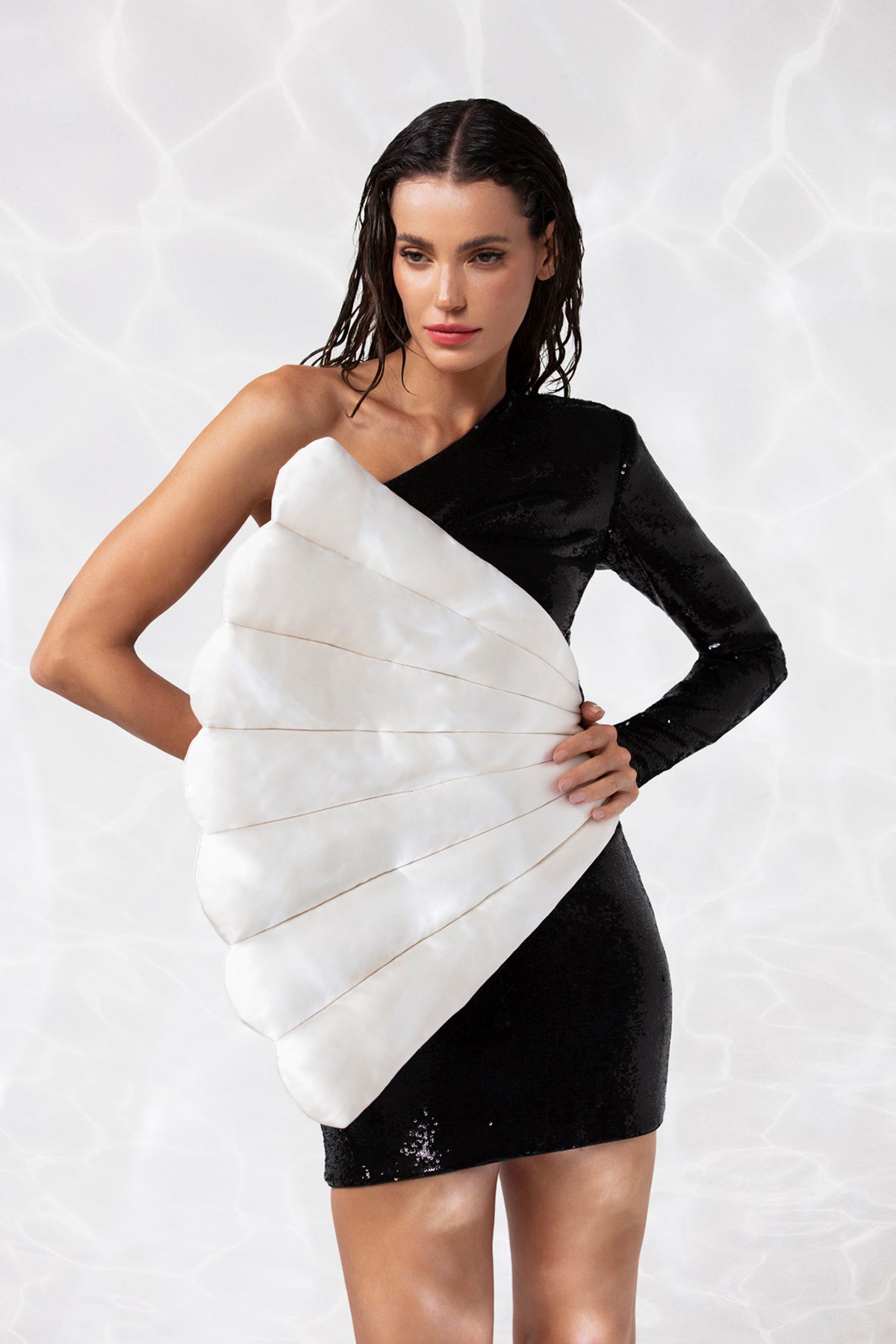 Off the shoulder embroidered black crêpe dress with tulle sleeves