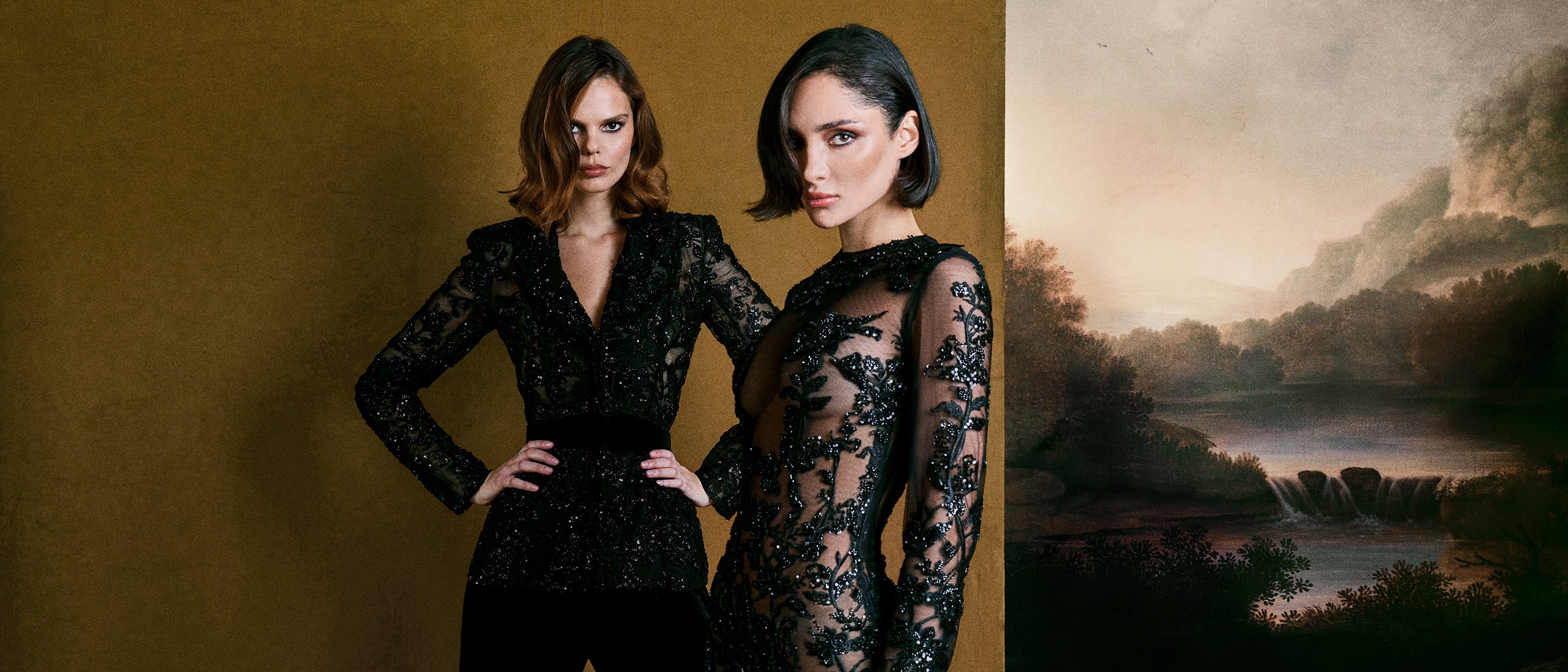 Off the shoulder embroidered black crêpe dress with tulle sleeves