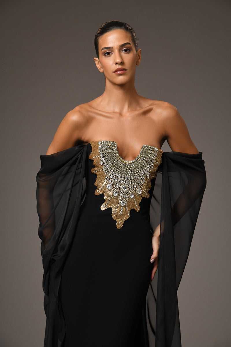 Off the shoulder embroidered black crêpe dress with tulle sleeves