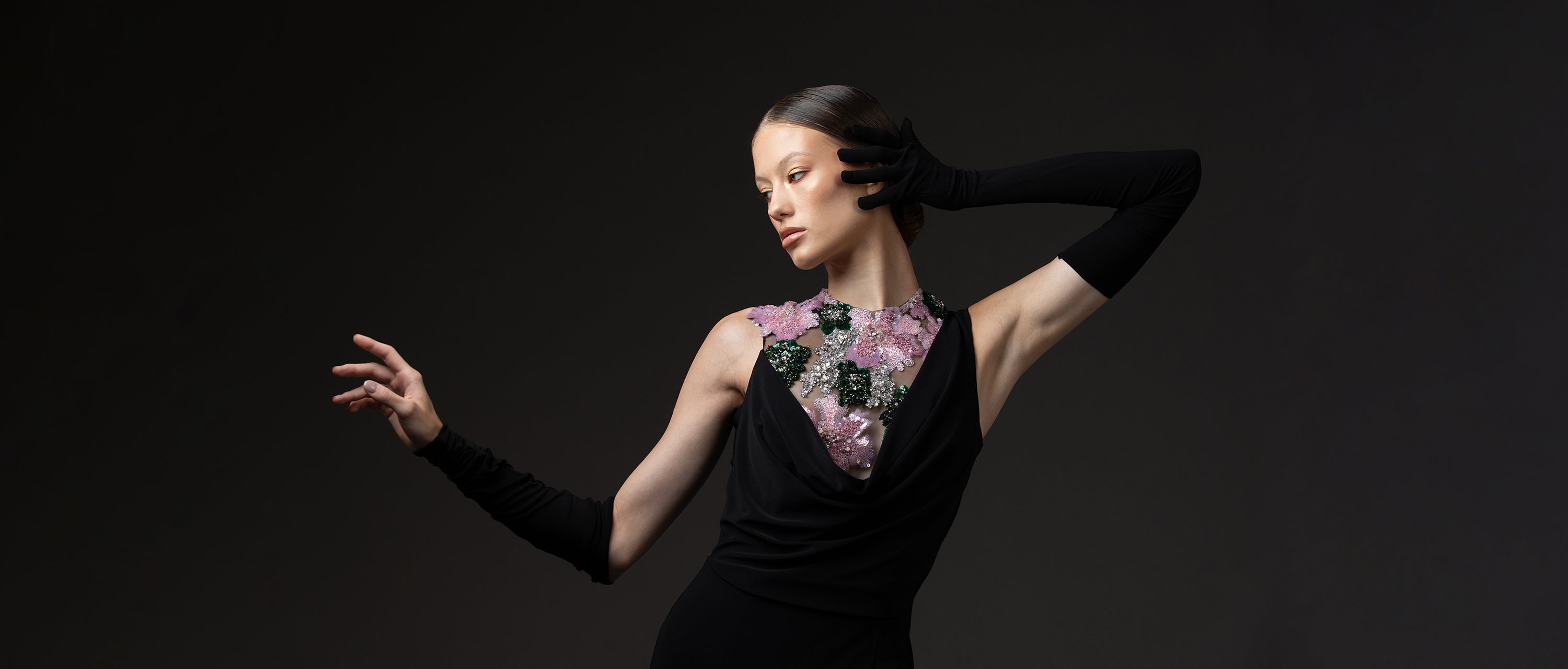 Off the shoulder embroidered black crêpe dress with tulle sleeves