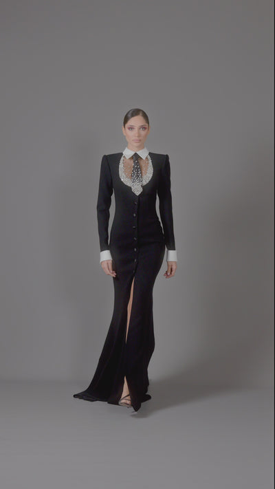 فستان قصير من الكريب الأسود مزين بفيونكة من الكريستال