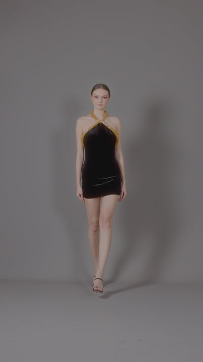 فستان قصير من الكريب الأسود مزين بفيونكة من الكريستال