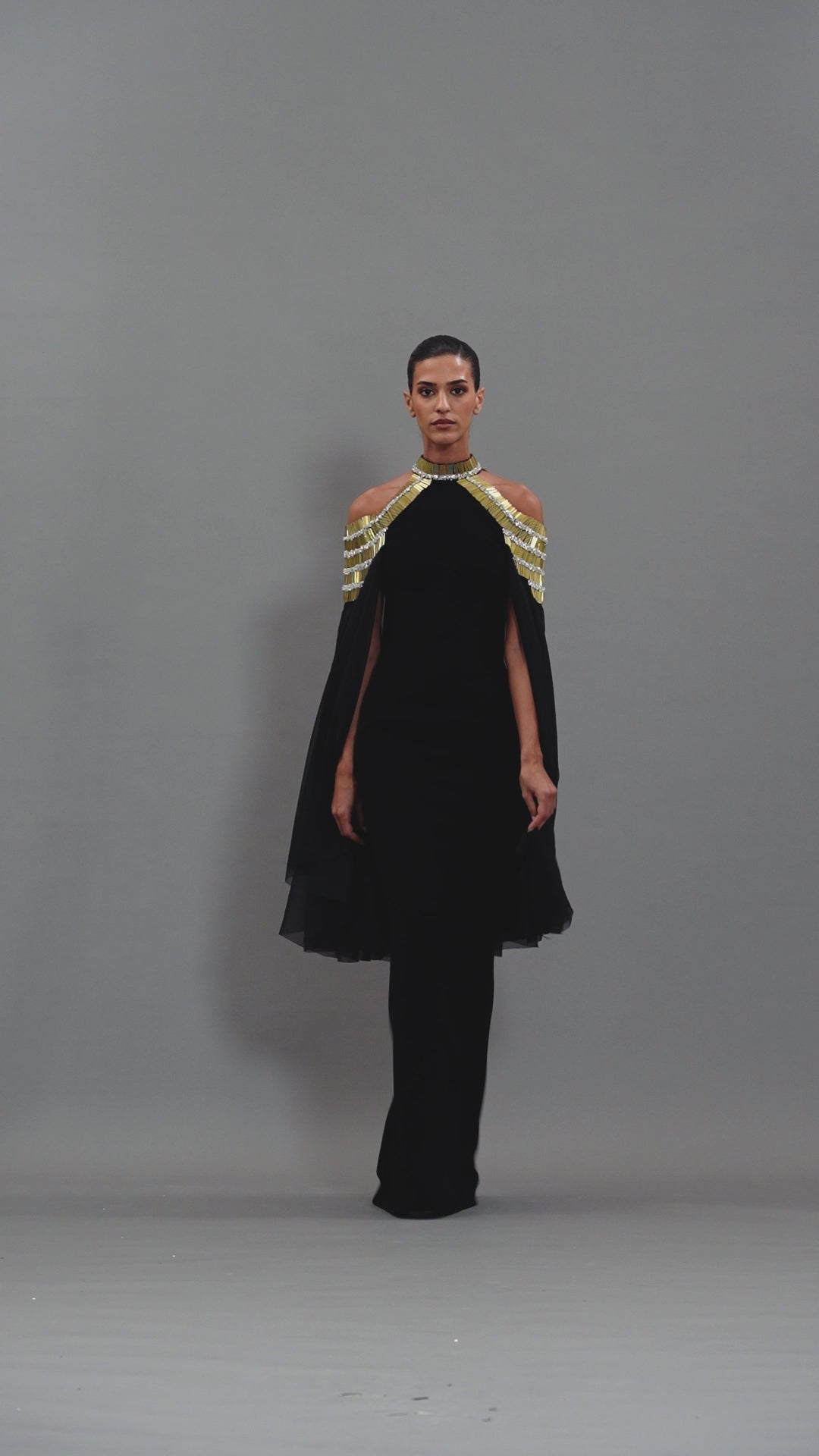 فستان كريب أسود مع تطريز وأكمام على شكل كيب