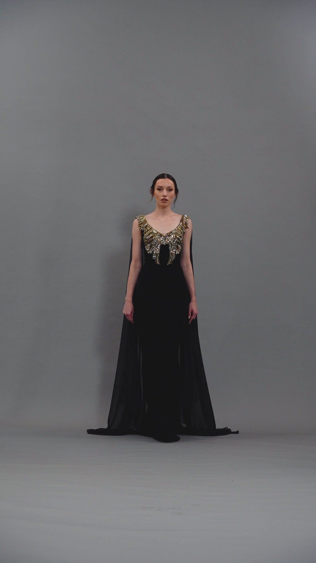 فستان كريب أسود مع تطريز وعباءة شيفون