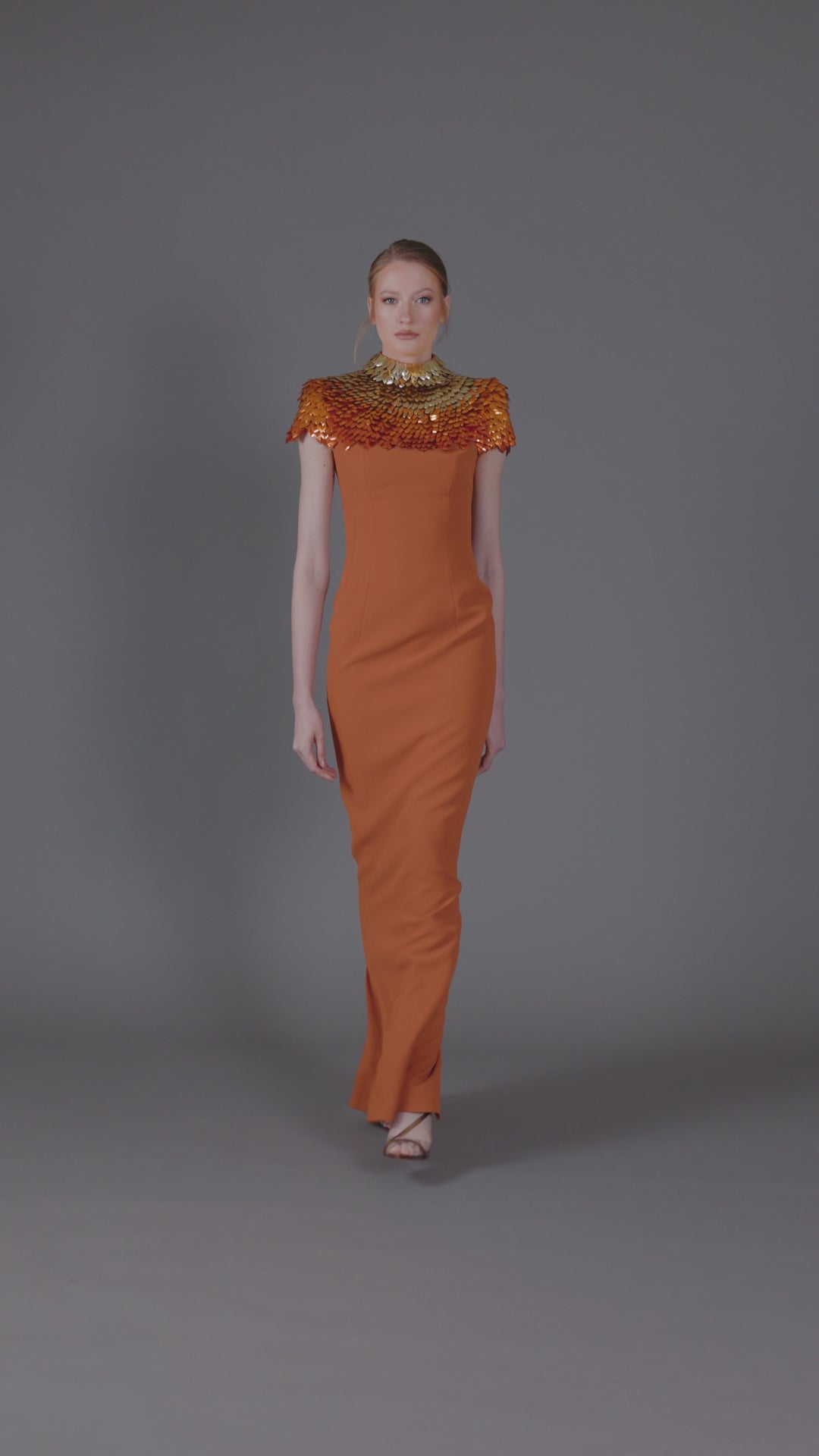 فستان من الكريب من الطوب المحروق مع زخارف أوراق ثلاثية الأبعاد