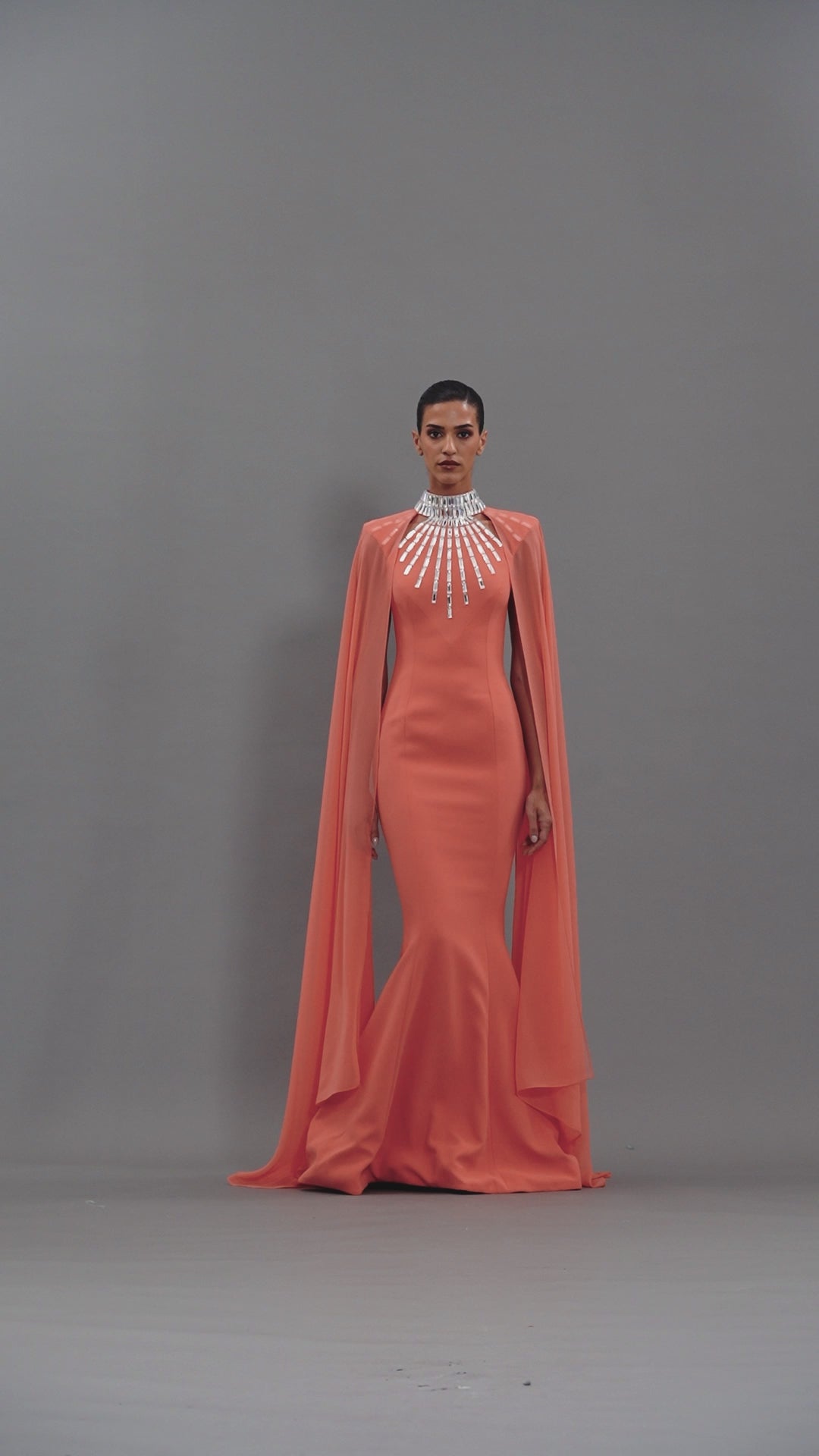 فستان من الكريب المرجاني مع تطريز باغيت وشيفون