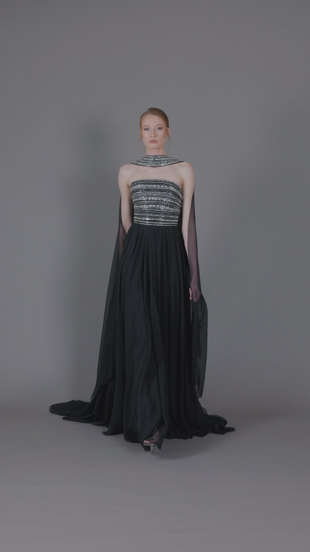 فستان أسود مطرز مع تنورة شيفون وعباءة