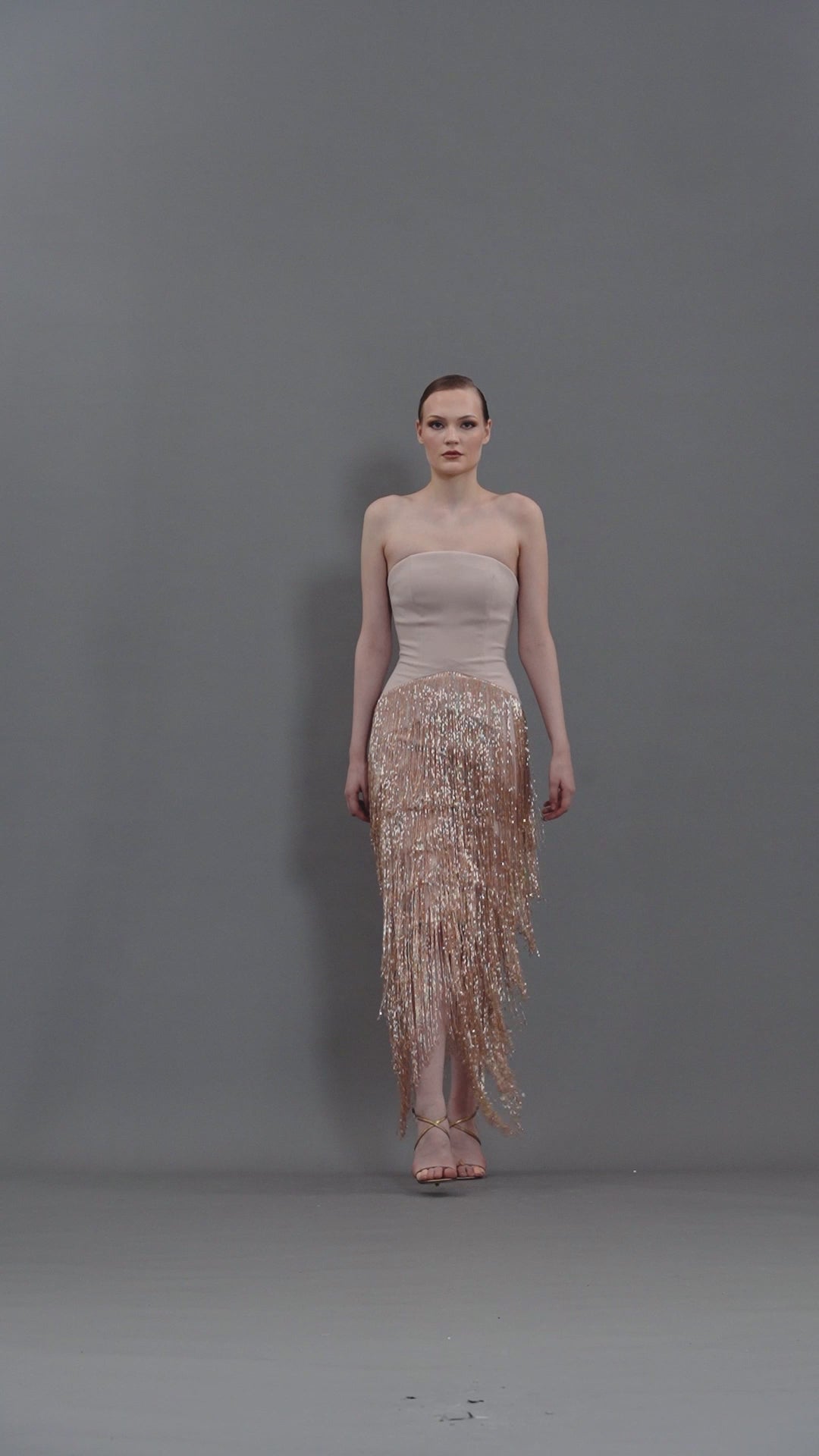 فستان من الكريب بلون البيج مع شراشيب من الخرز متعدد الطبقات
