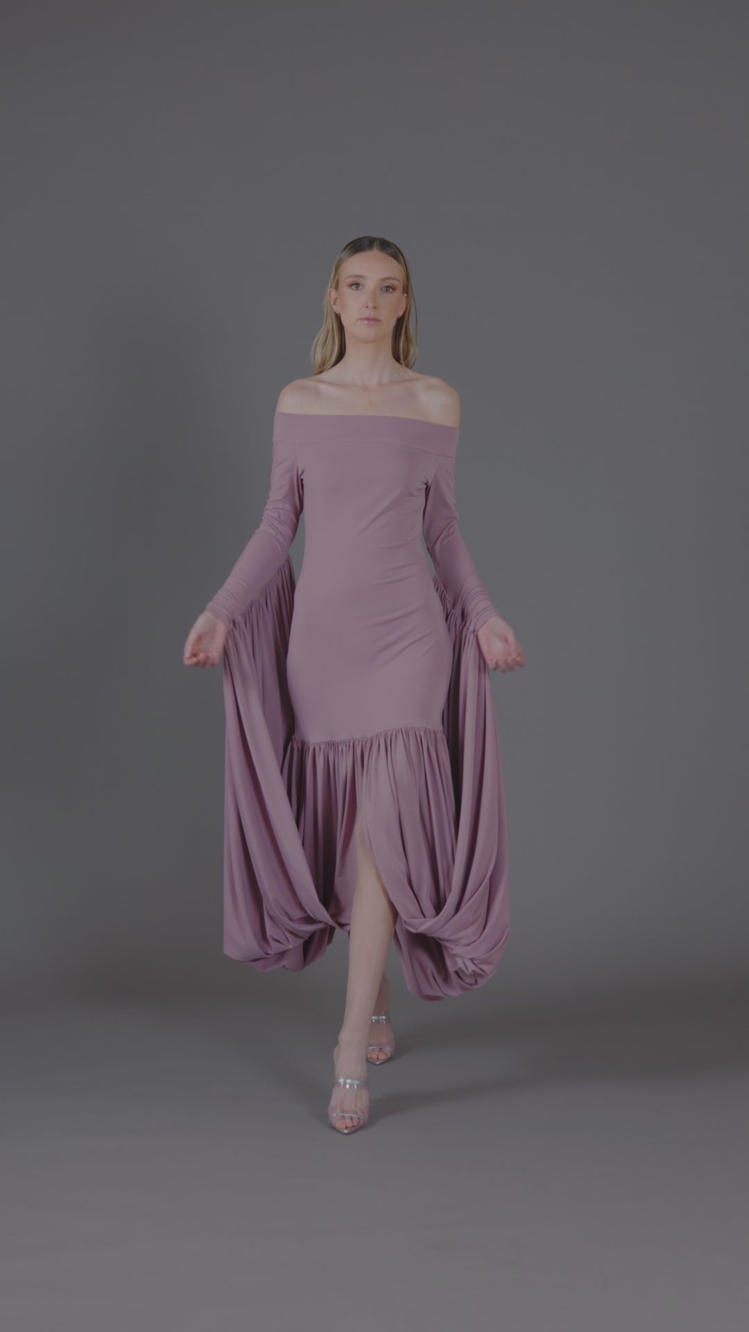 فستان جيرسي قصير وردي عتيق مكشوف الكتفين