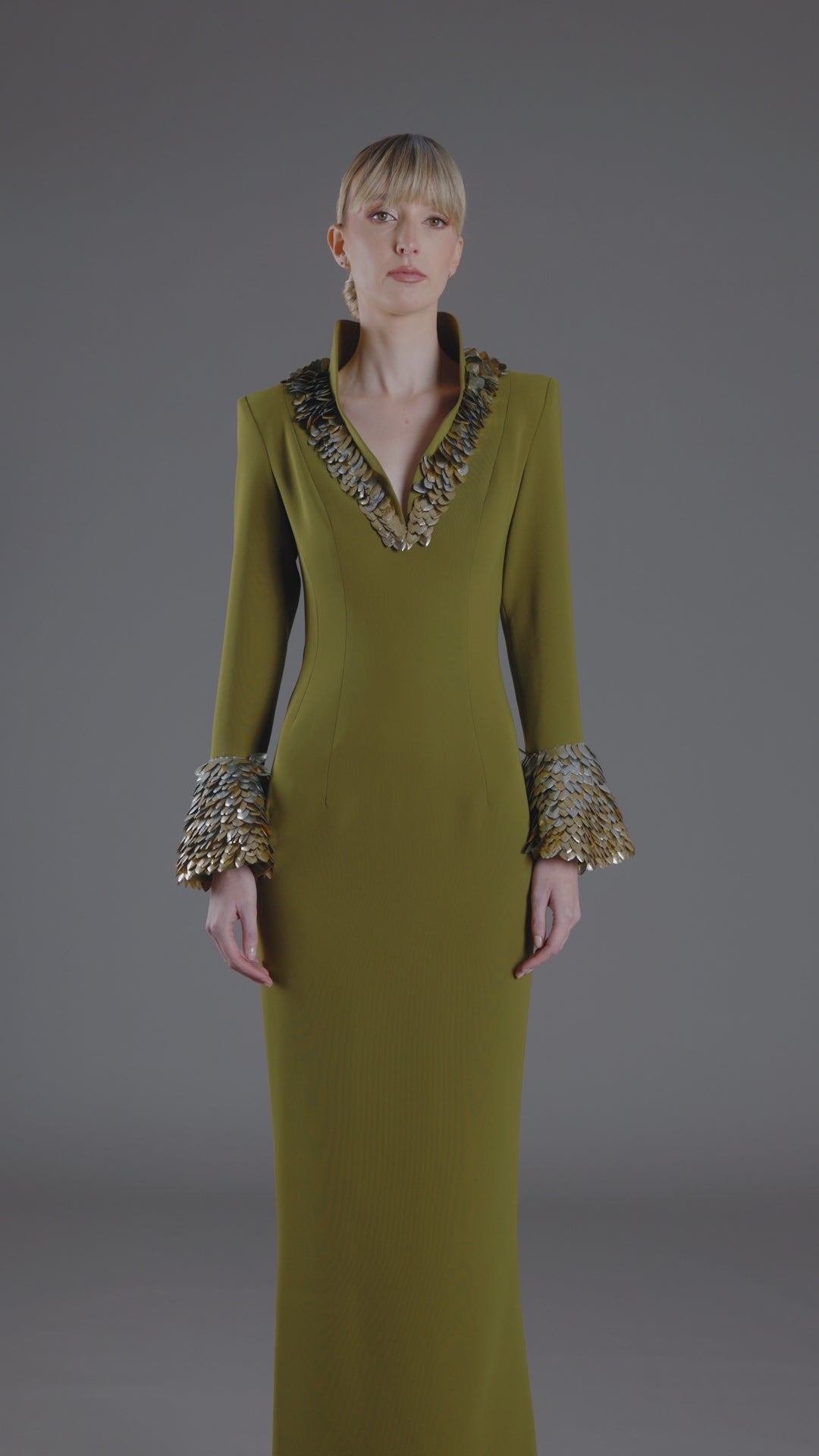 فستان من الكريب باللون الأخضر الزيتوني مع زخارف أوراق ثلاثية الأبعاد وأكمام جرس