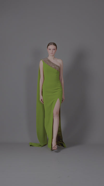 Asymmetrical dress featuring a crystal embellished bust and a cascading cape.