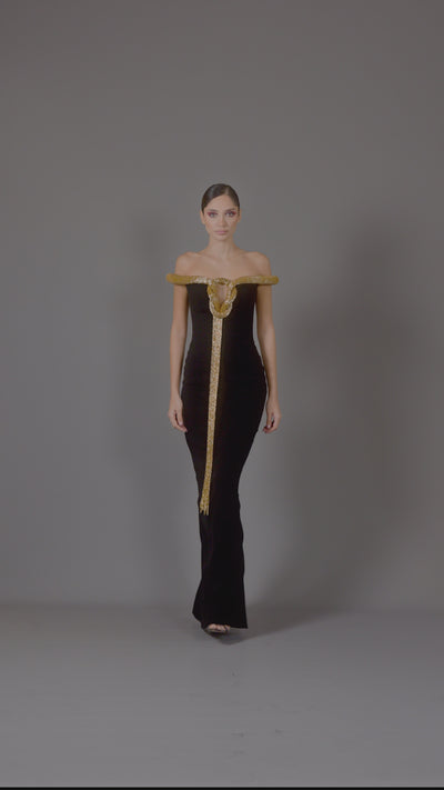 Off the shoulder crêpe gown featuring an embroidered neckline with fringes