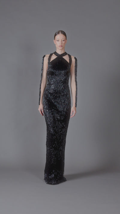 Black sequin and bugle bead embroidered dress with sheer sleeves