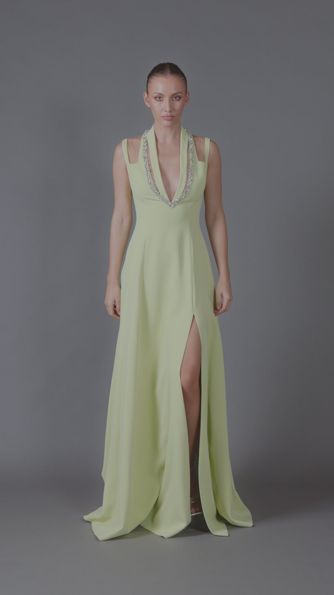 Light pistachio A-line crêpe dress with embroidery and a slit