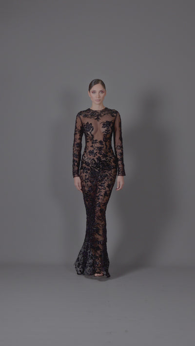 Sheer gown with black embroidery