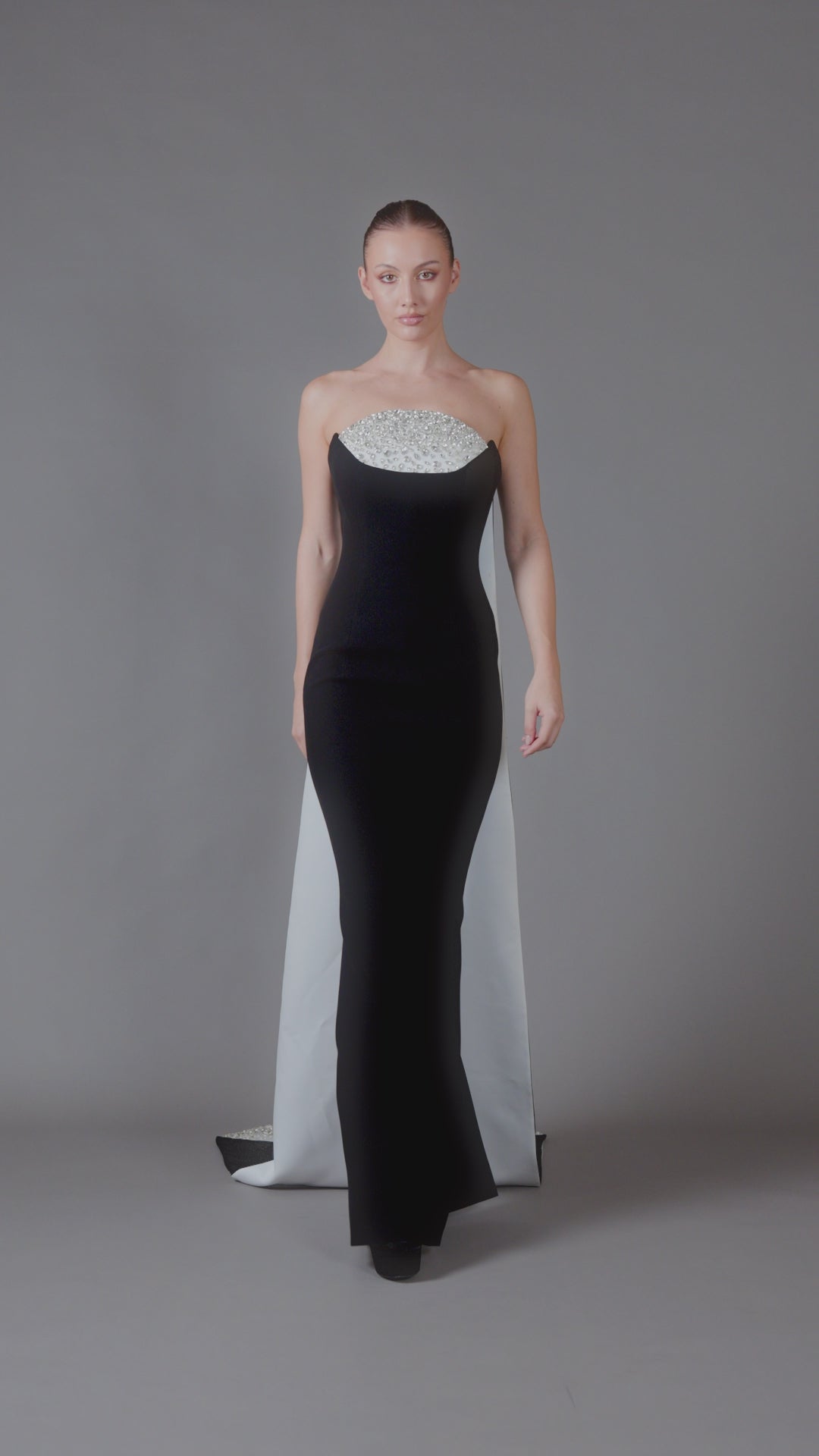 Strapless black crêpe dress with white radzimir bust, embellished with crystal embroidery and a back train