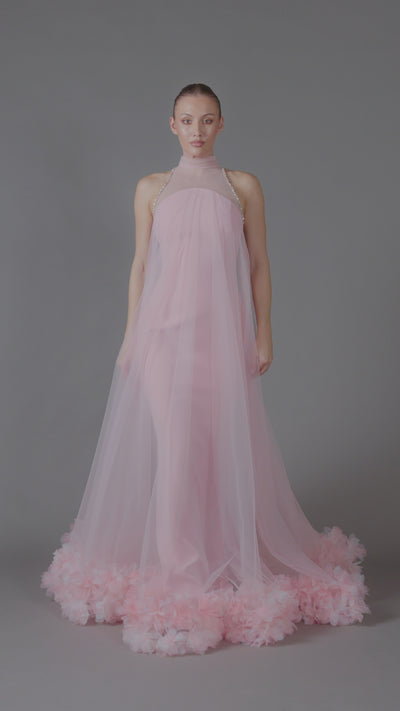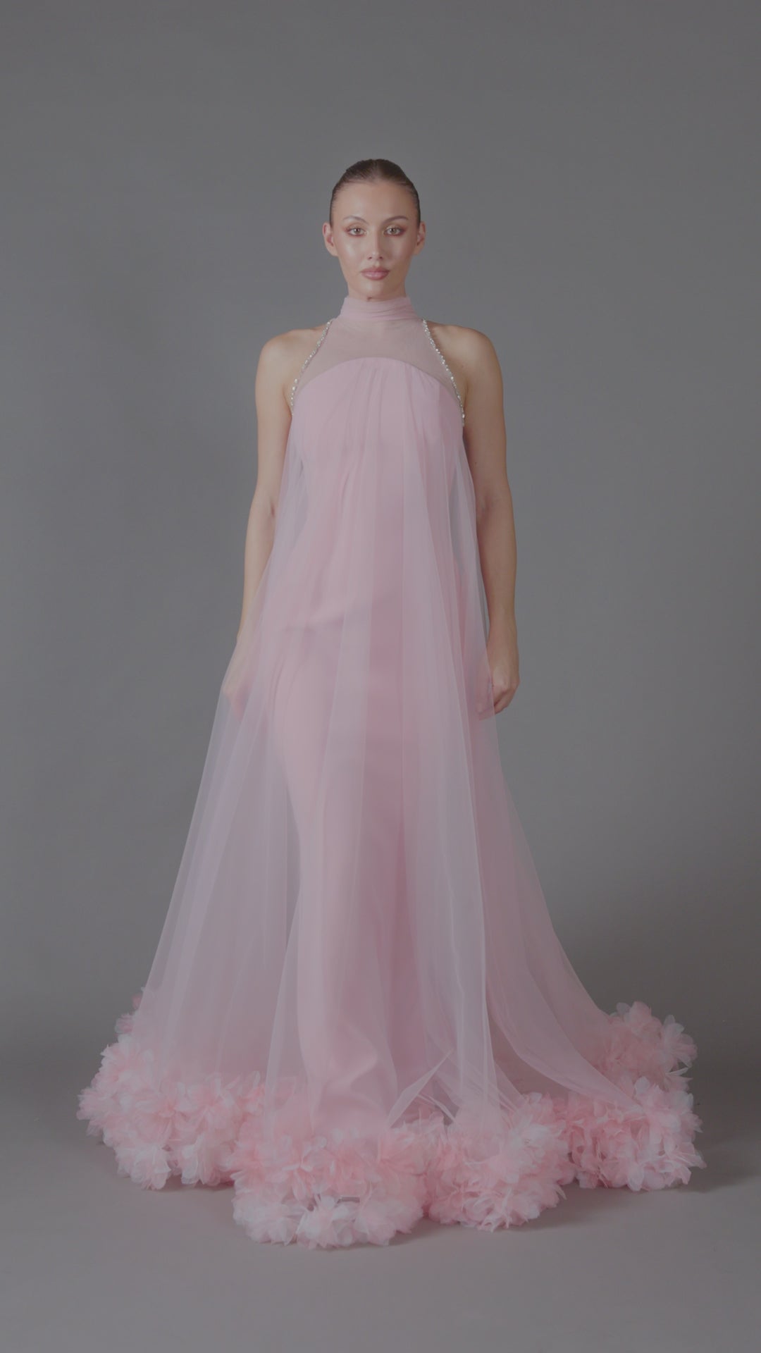 Strapless blush pink crêpe dress, layered under a halter neck tulle overlay with floral embroidered hemline and crystal embroidered detailing
